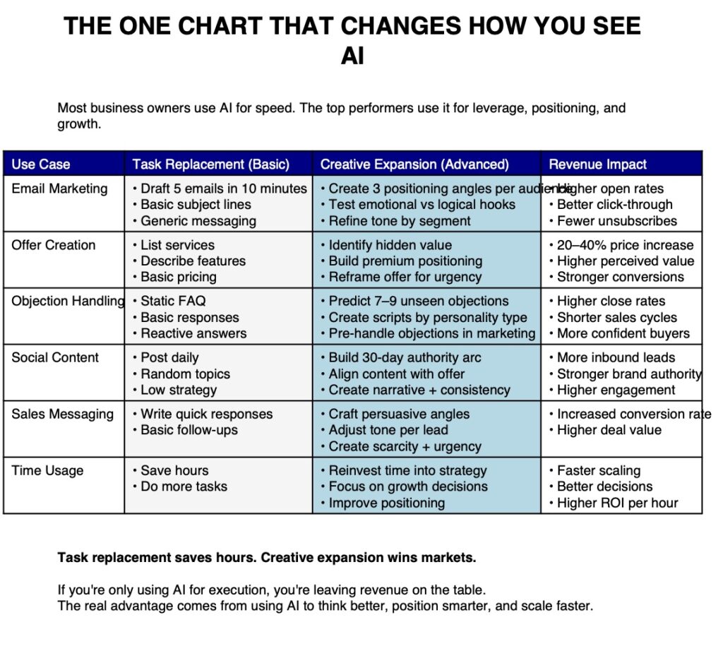 Here’s the uncomfortable truth: Task replacement makes you feel productive. Creativity expansion makes you profitable. And right now, 87% of small business owners are mistaking speed for leverage.
